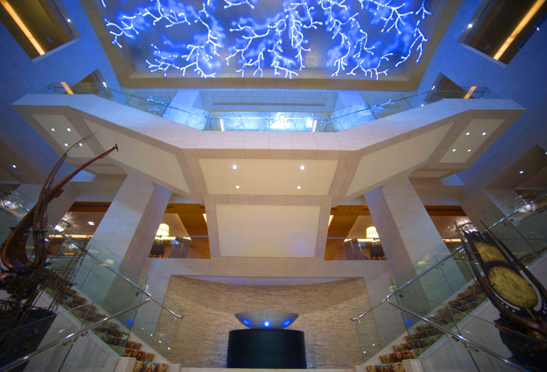 The façades are clad with granite, and the internal fitout combines modern and Arab-style design. One of the enormous patios has a waterfall about 40 metres high running down a curtain wall.